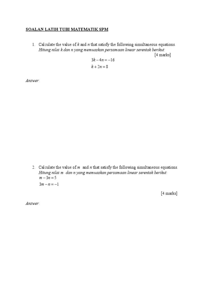 Latihan Soalan Persamaan Linear Tingkatan 1 : Latihan Penyelesaian Persamaan Linear Pt3 Pdf. Nota matematik tingkatan 2 bab 4 : Interactive worksheet latihan operasi bentuk lazim tambah, . Latihan matematik tingkatan 1 ini lengkap dengan 13 bab soalan kuiz. Latihan matematik tingkatan 1 (bab 5, 6) + jawapan (ungkapan algebra + persamaan linear). ٤ جمادى الأولى ١٤٤٣ هـ. Membentuk persamaan linear dalam dua pemboleh ubah.